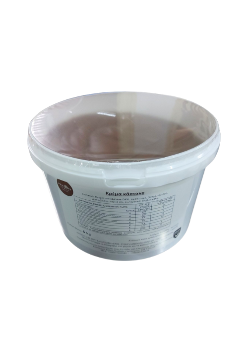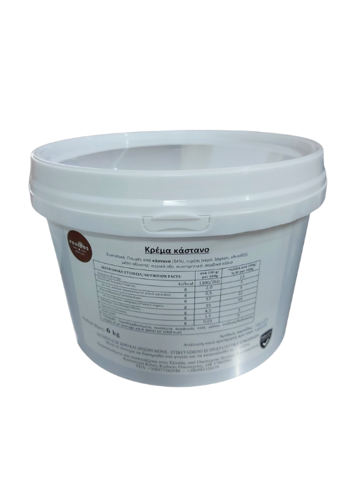Κρέμα Κάστανου Poulios 6kg. Παραδοσιακό προϊόν από το Πάικο Κιλκίς, με 54% ελληνικό κάστανο. Παραγωγή με πιστοποίηση HACCP, φυσική διαδικασία βρασμού και συσκευασία σε τροποποιημένη ατμόσφαιρα. Ιδανική για ζαχαροπλαστική, γεμίσεις και επαγγελματική χρήση.