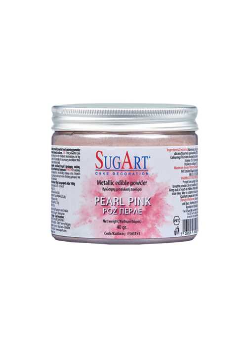 Μεταλλική πούδρα σε ροζ περλέ χρώμα, κατάλληλη για τρόφιμα. Προσφέρει λαμπερό, πολυτελές φινίρισμα σε επαγγελματικές δημιουργίες ζαχαροπλαστικής και σοκολατοποιίας.