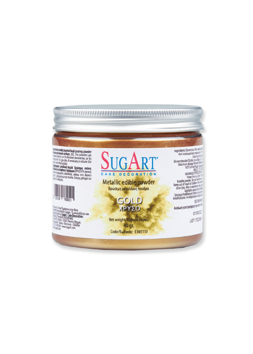 Μεταλλική πούδρα χρυσού χρώματος, κατάλληλη για τρόφιμα. Προσφέρει λαμπερό, πολυτελές φινίρισμα σε επαγγελματικές δημιουργίες ζαχαροπλαστικής και σοκολατοποιίας.