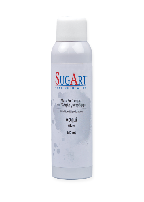 Μεταλλικό σπρέι ασημί 150 ml, κατάλληλο για τρόφιμα. Προσφέρει λαμπερό μεταλλικό φινίρισμα σε γλυκά, τούρτες και σοκολάτες! Εύκολο στη χρήση, γρήγορο στέγνωμα, ιδανικό για επαγγελματίες ζαχαροπλάστες.